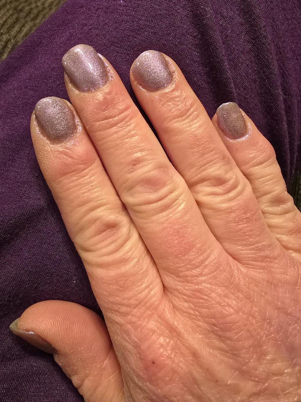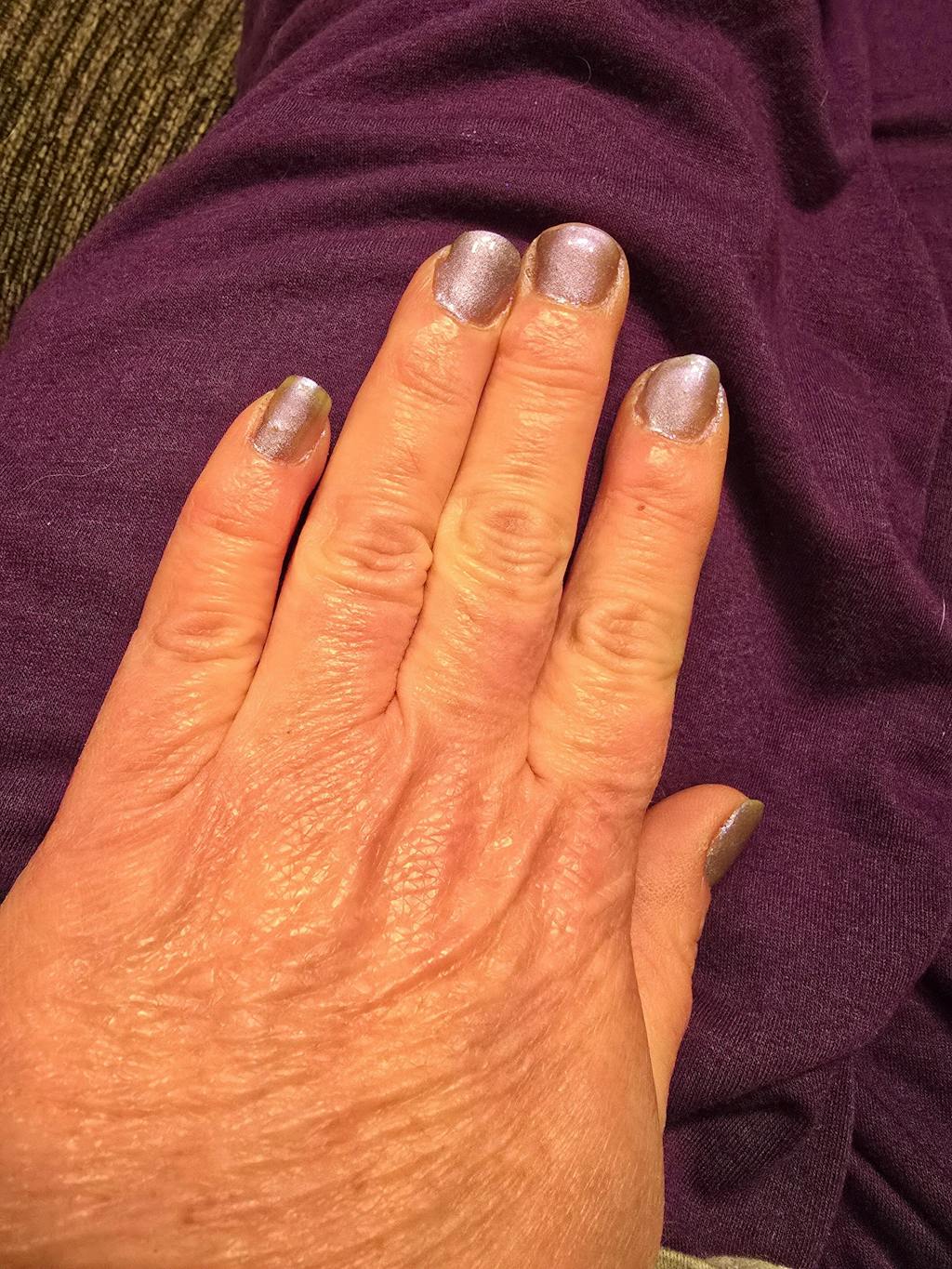 This color is beautiful! It can be purple if applies over a cured base coat or pinkish if applied over a cured top coat. This is applied over a cured base coat.